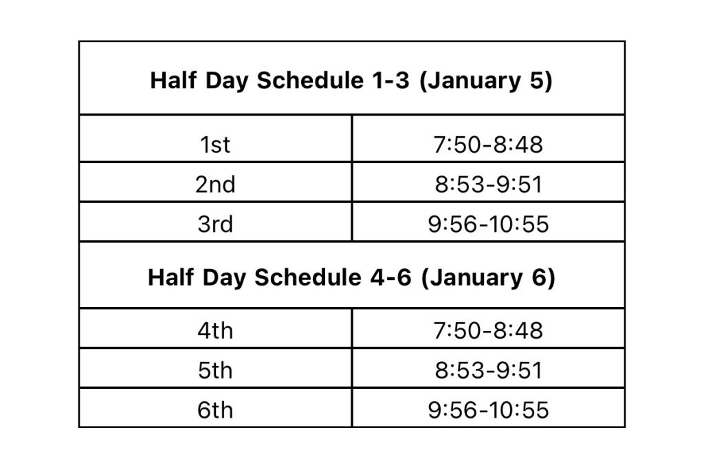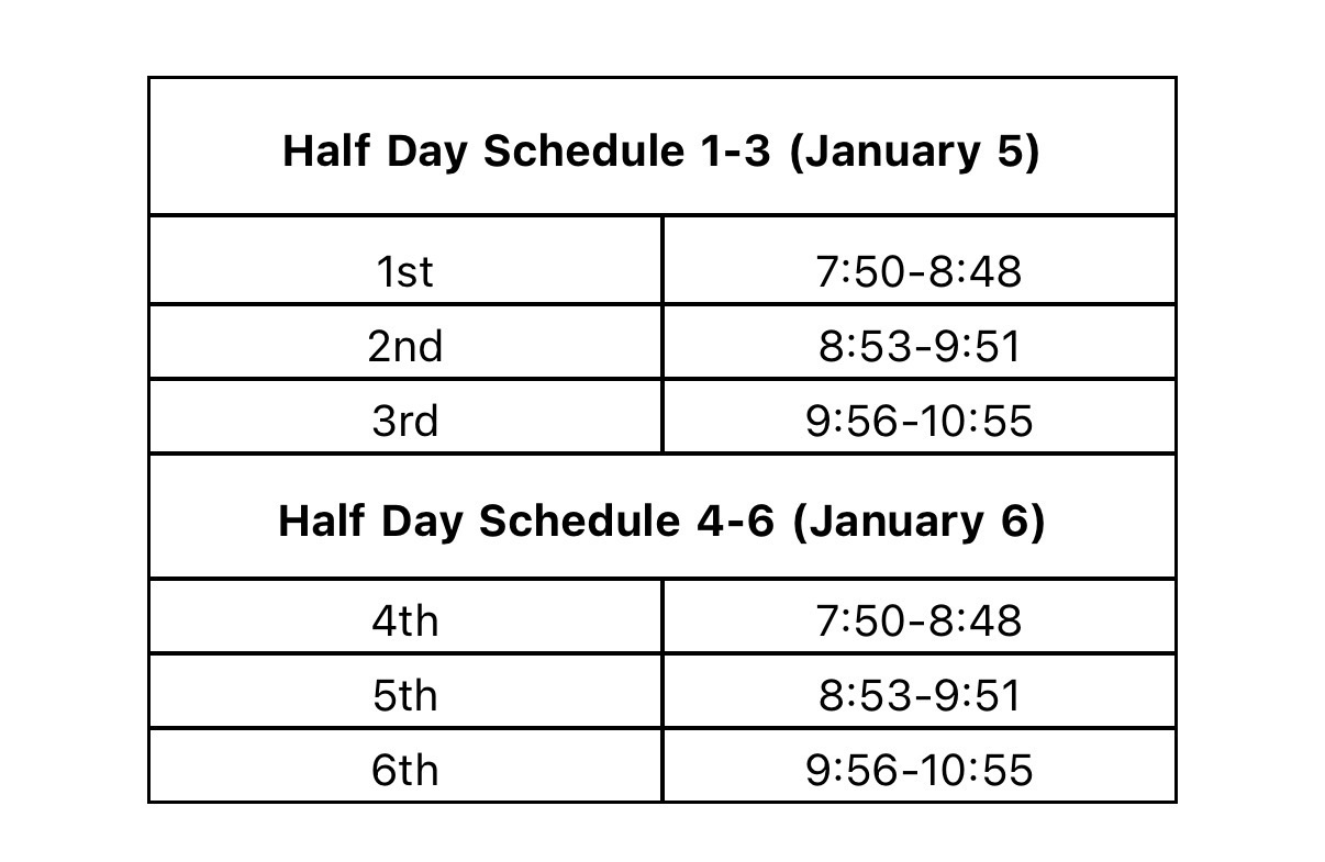 Happy New Year! We hope you had a wonderful break! Today is the start of  second semester classes. Students and parents are able to view schedules on student/parent connect. Semester 1 grades will be available sometime next week. January 5th and 6th (Monday and Tuesday) are half days.  Below is the schedule  for the next two days! We look forward to a great start to the new semester.